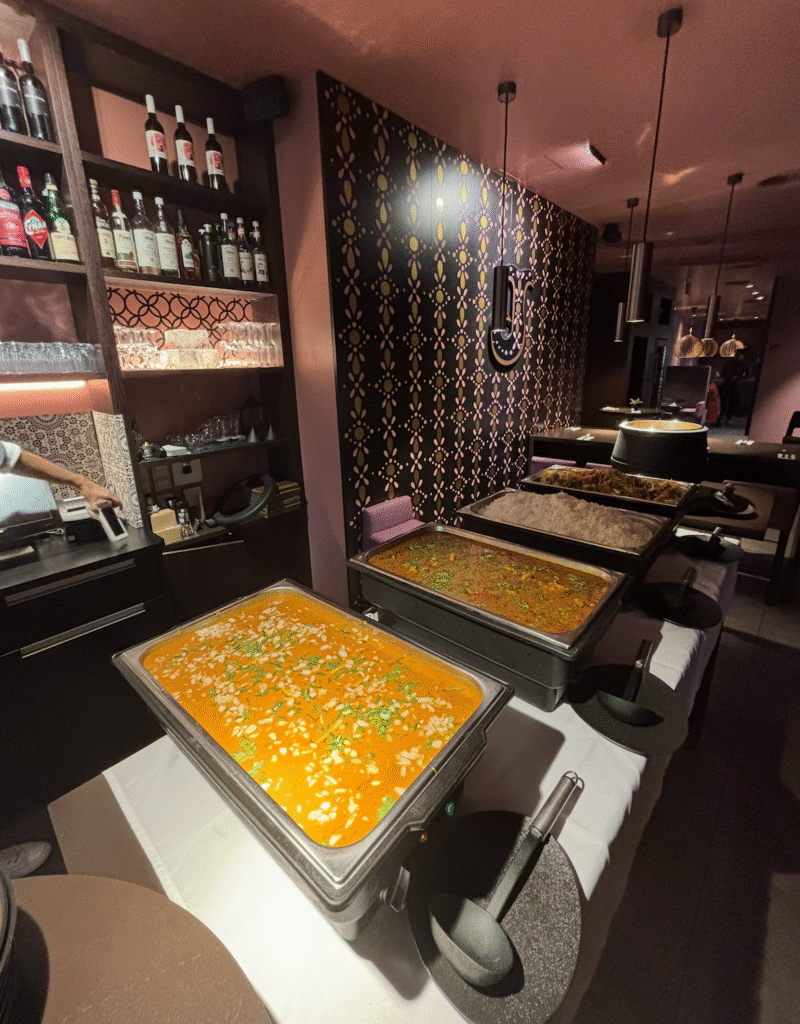 Auch unser Interior verbindet das Beste aus zwei Welten: moderne Elemente treffen auf traditionelle indische Akzente – warm, einladend und mit viel Liebe zum Detail gestaltet. So schaffen wir eine Atmosphäre, in der man sich wohlfühlt und den Alltag hinter sich lassen kann.